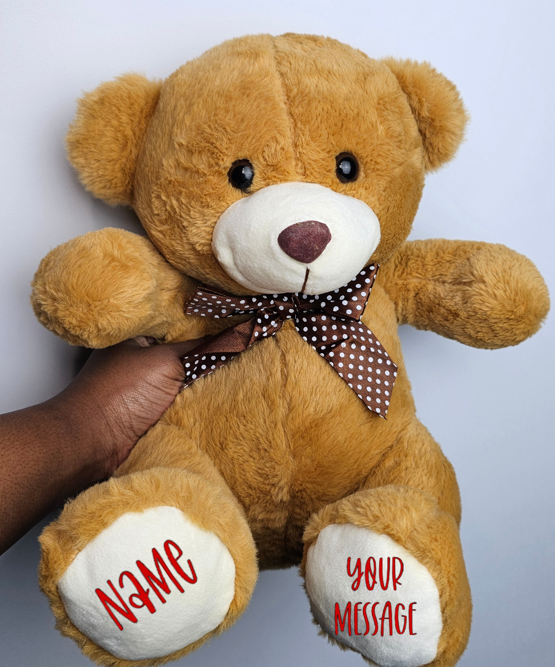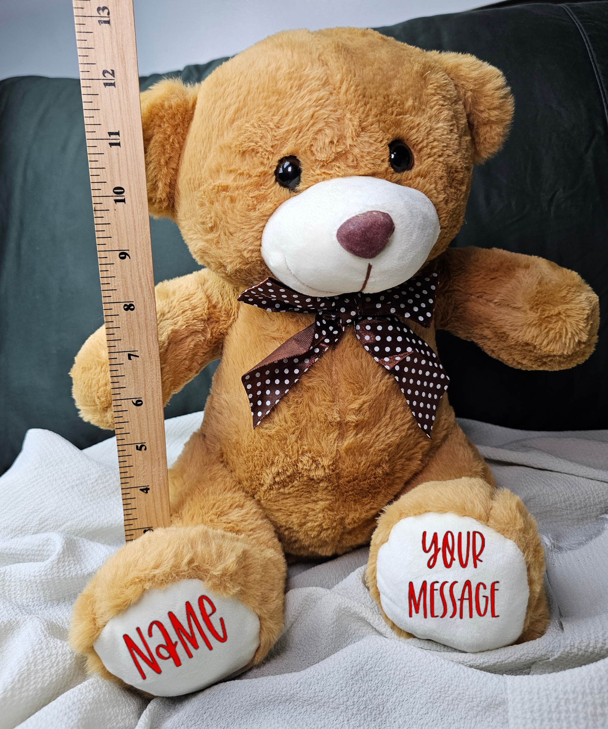 The teddy bear is about 12 inches tall and the feet can be personalized with your message.
