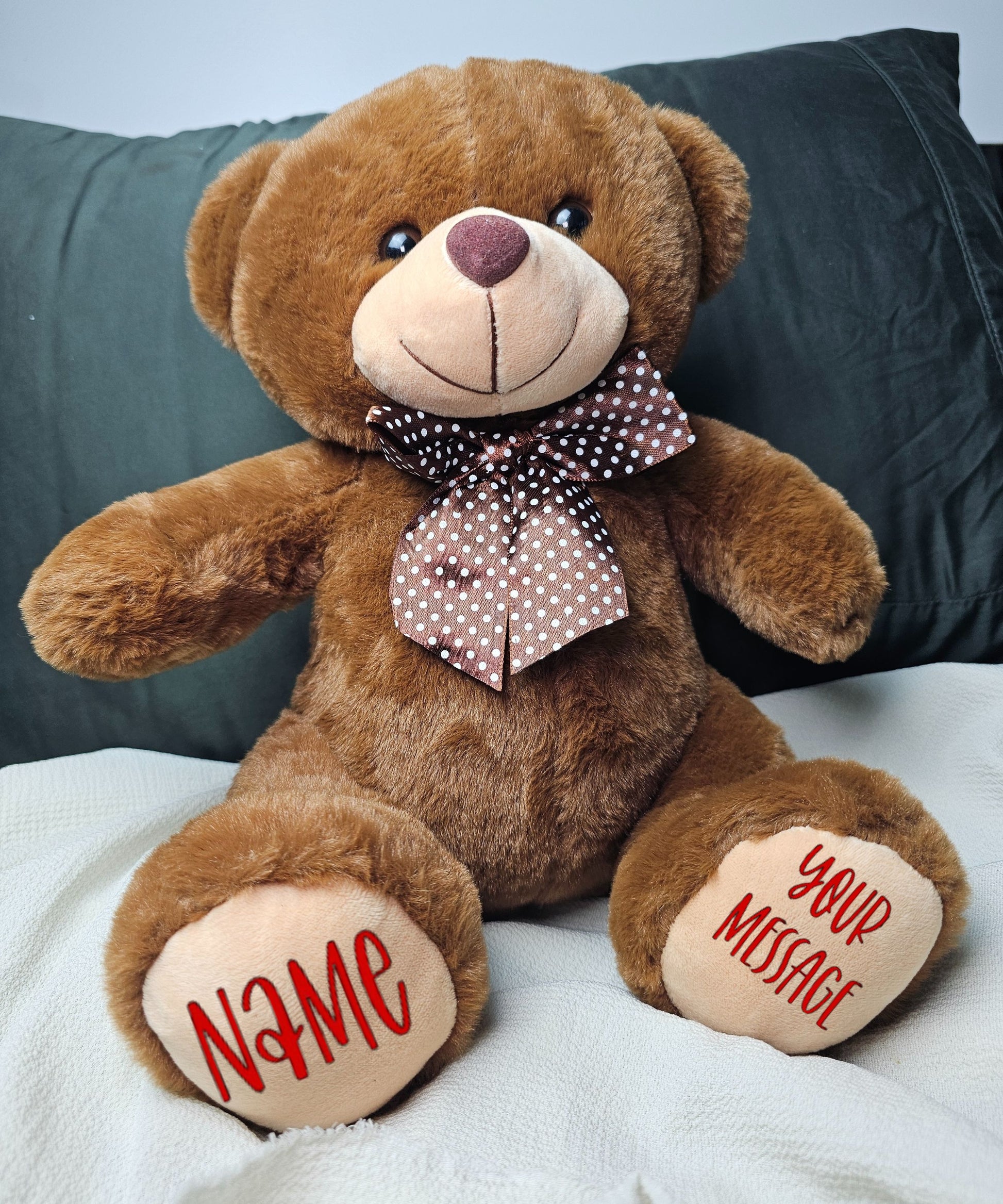 The teddy bear is about 12 inches tall and the feet can be personalized with your message.