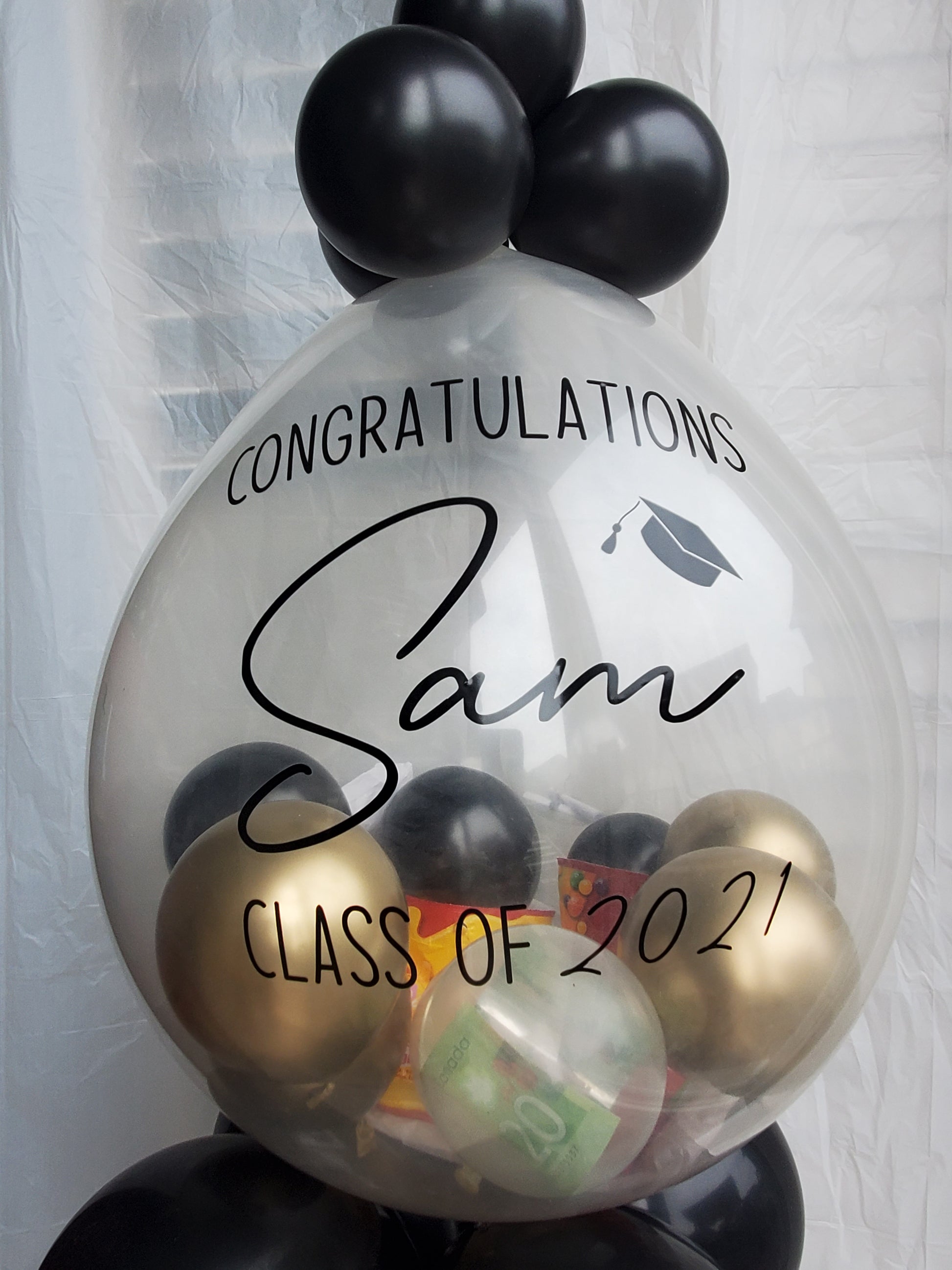 This Graduation balloon is perfect for the new graduate! add well wishes, candy, lights and a monetary gift. Can also be made as a group gift! monetary gifts can be separated with money bags (see images).