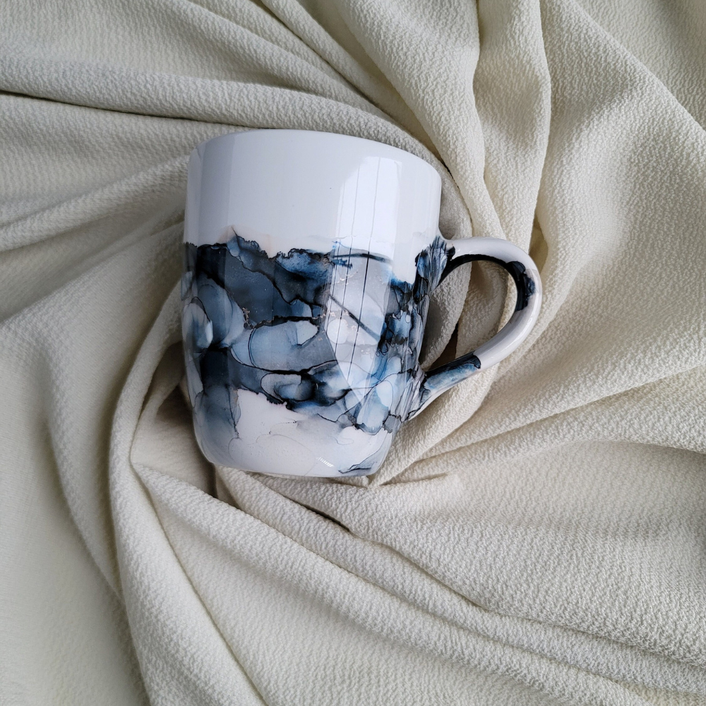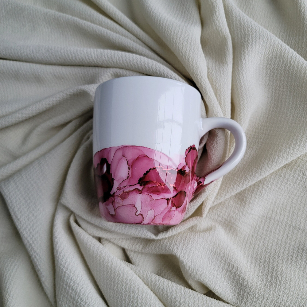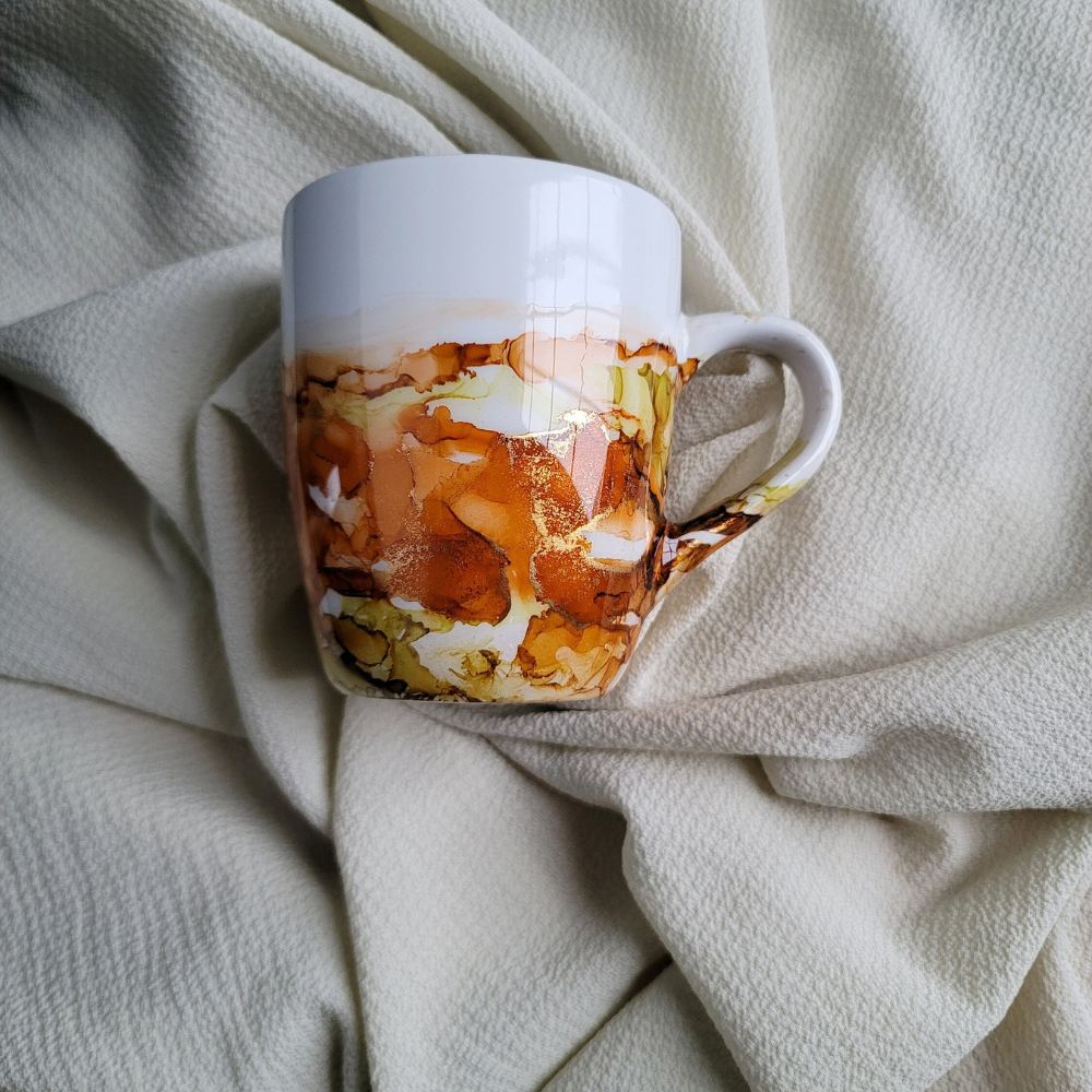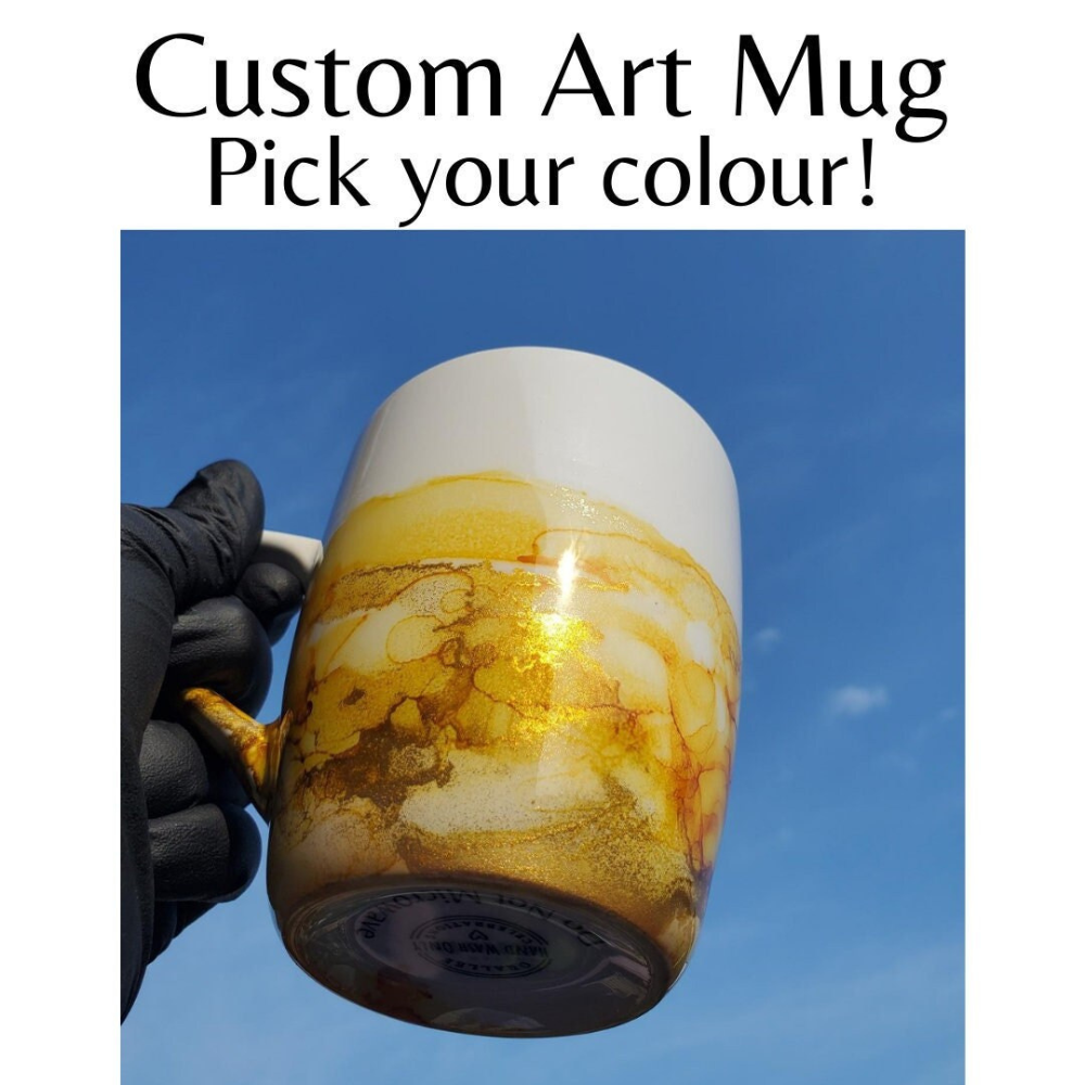 This mug is hand painted with alcohol ink and then sealed with a non toxic gloss sealer.