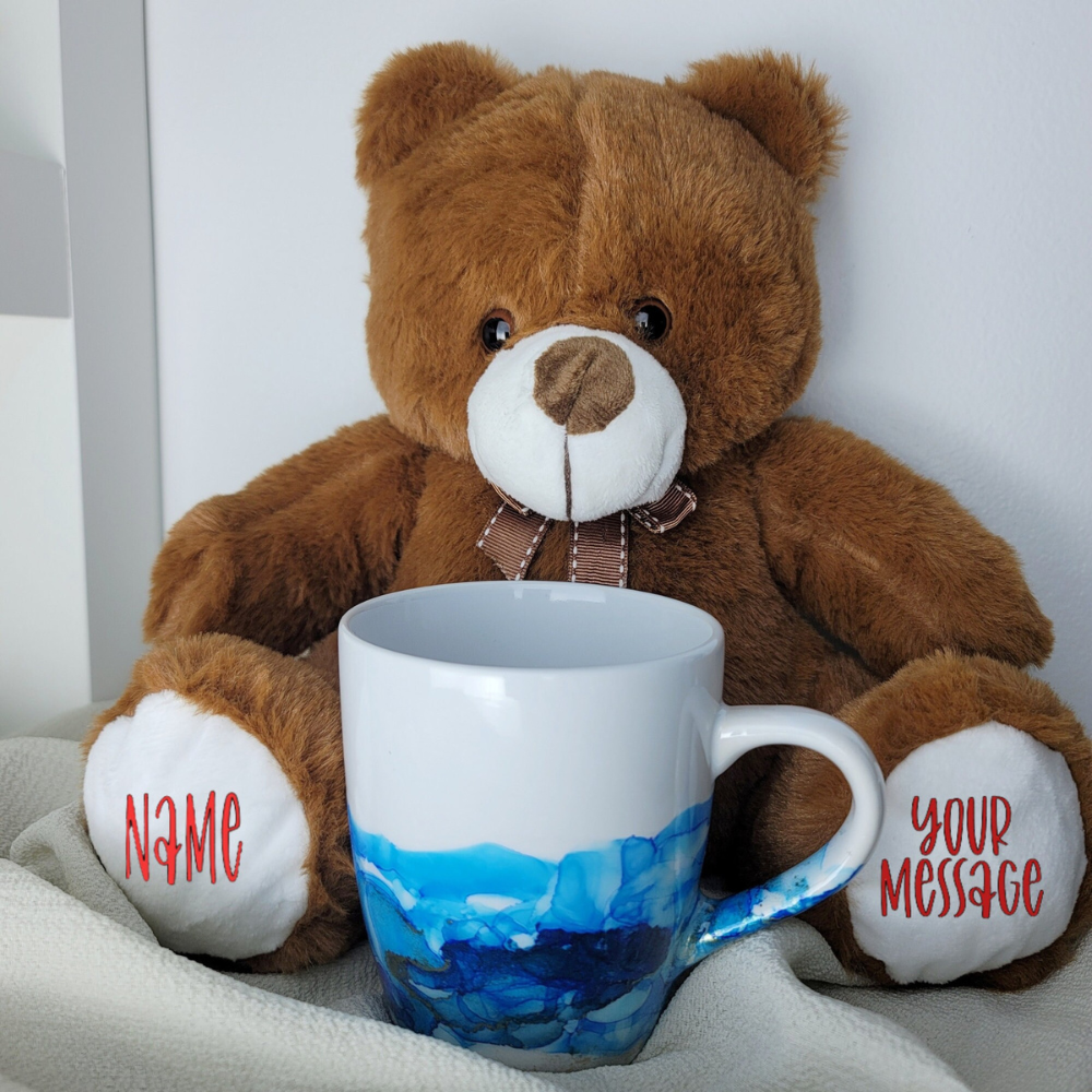 This super soft and adorable teddy bear is the perfect gift for Get well soon, Anniversaries, Babies, Best wishes and so much more. Paired with a custom mug!